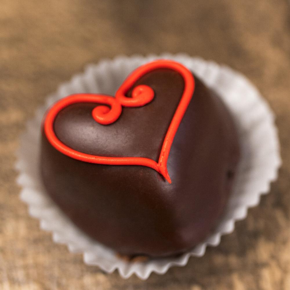 Just for Valentine’s Day, we make heart shaped petit fours filled with whipped cream made in both vanilla and chocolate cake then poured in a rich, thick glaze.